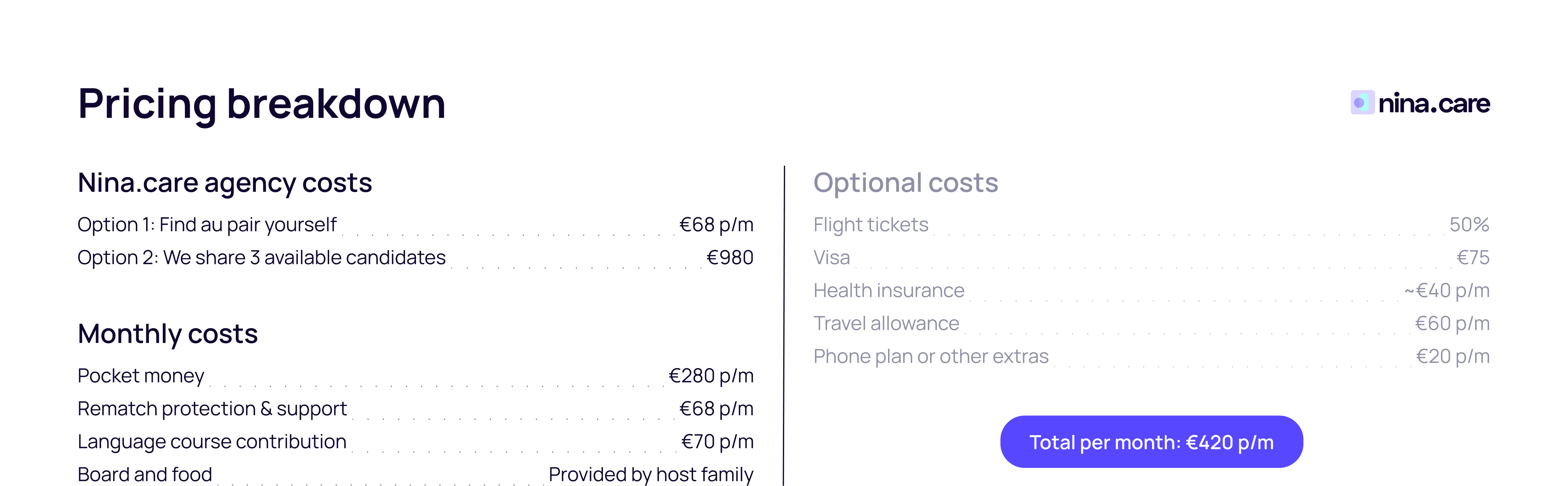 Hosting an au pair in Germany costs about €420 per month. This includes the required monthly pocket money (€280), free room and board, contributions to health/accident/liability insurance, and a subsidy for a German language course (at least €50 per month). If using an agency, additional fees apply.