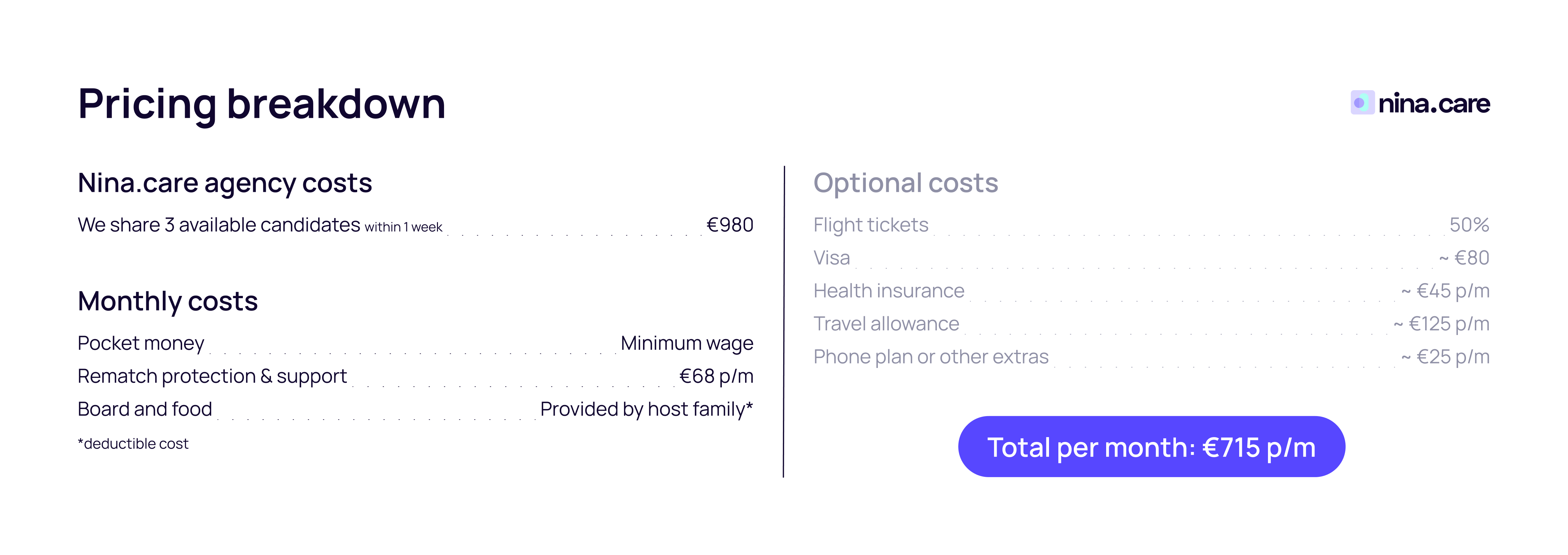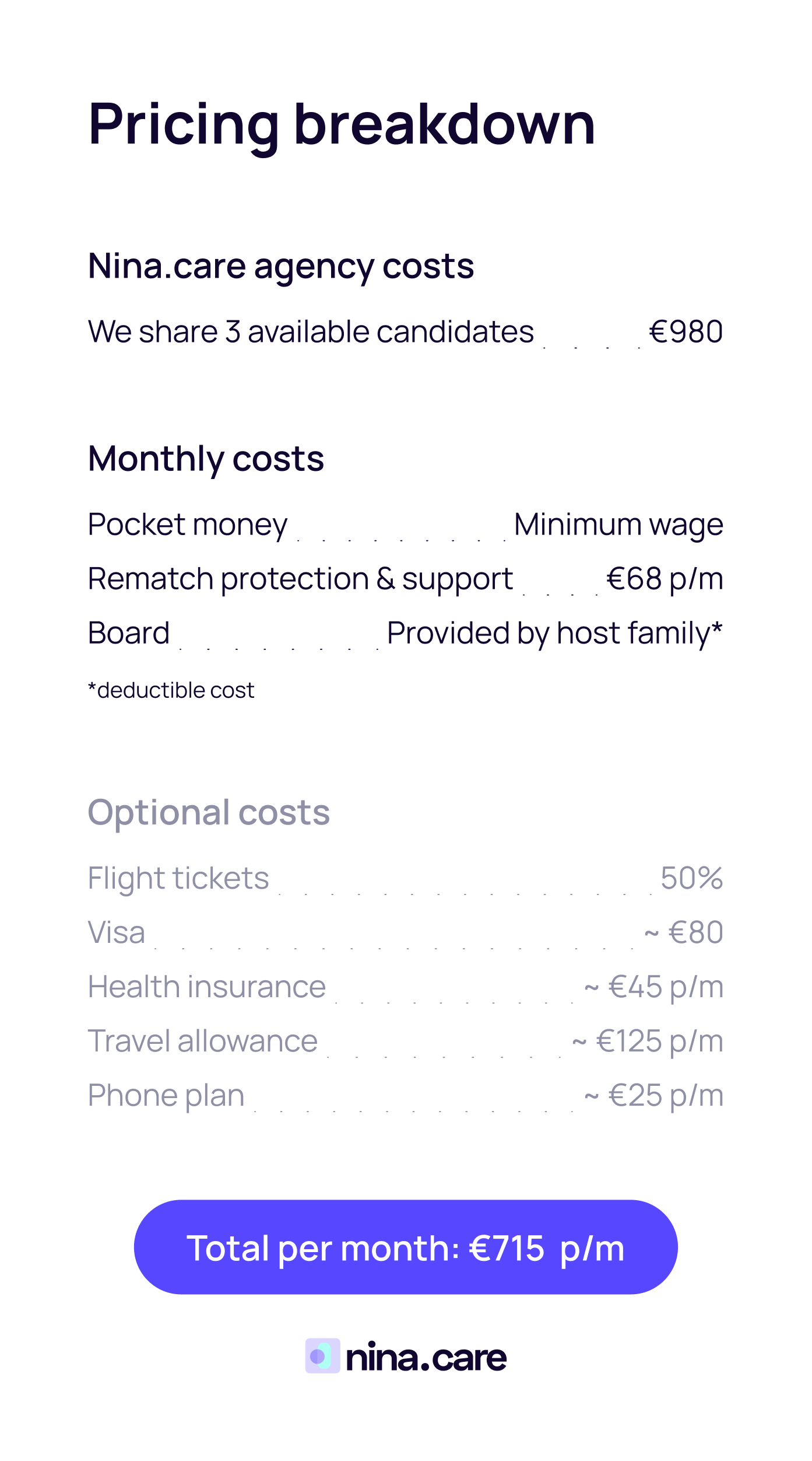 Hosting an au pair in Ireland generally costs around €715 p/m (calculated based on minimum wage for 20h per week) in pocket money, plus free room and board. Families may also contribute to language course fees and must cover health/accident insurance if the au pair is from outside the EU.
