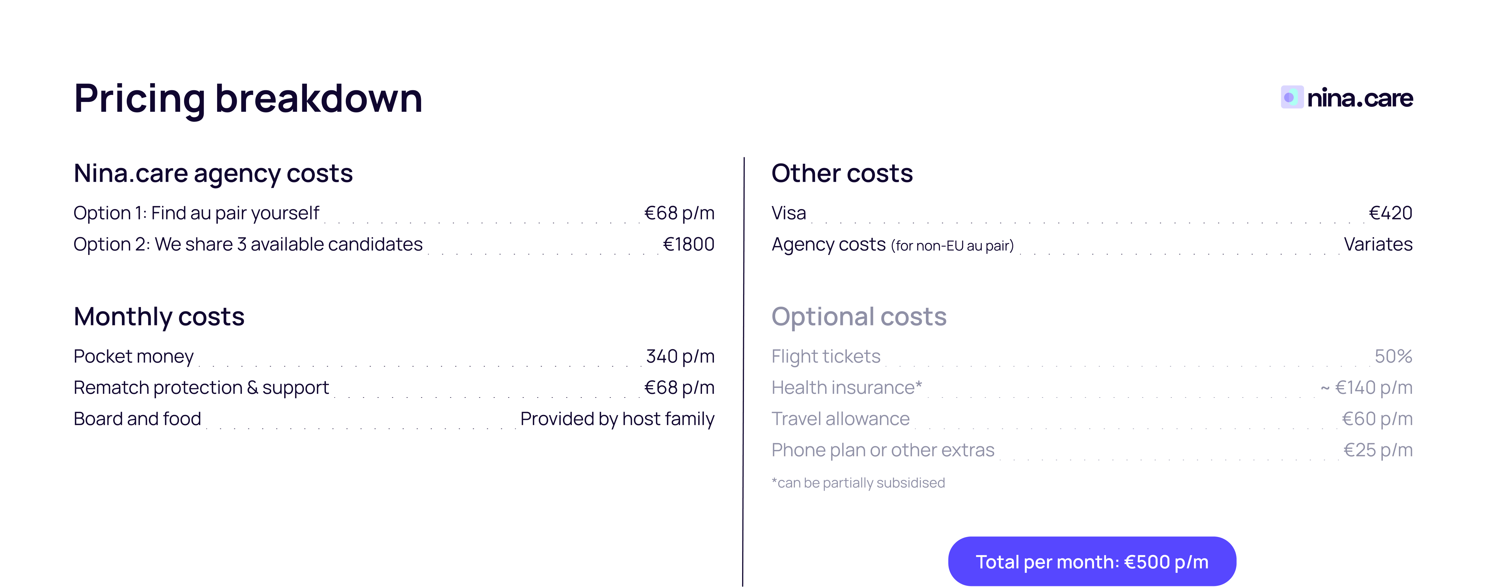 Au pairs in the Netherlands receive at least €340 per month in pocket money (set by the IND). As a host family you also provide room and board, Dutch health insurance, and sometimes contribute to transport or a language course. In addition, families pay the agency service fee and, for first-time hosts, the mandatory IND sponsorship fee.