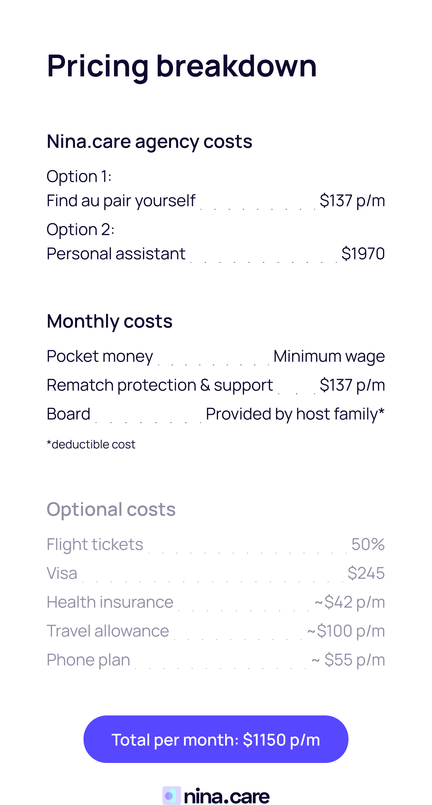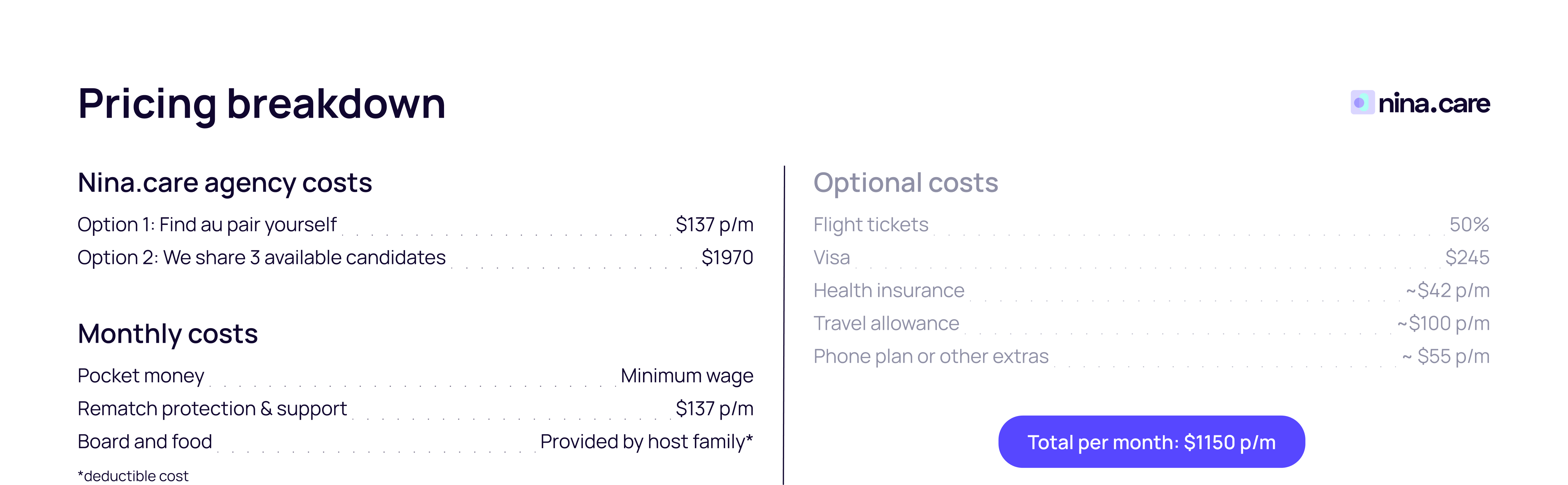 Hosting an au pair in New Zealand usually costs NZD 1150 p/m in pocket money, plus free room and board. Families must also cover accident insurance (ACC) and often contribute toward transport or language classes.