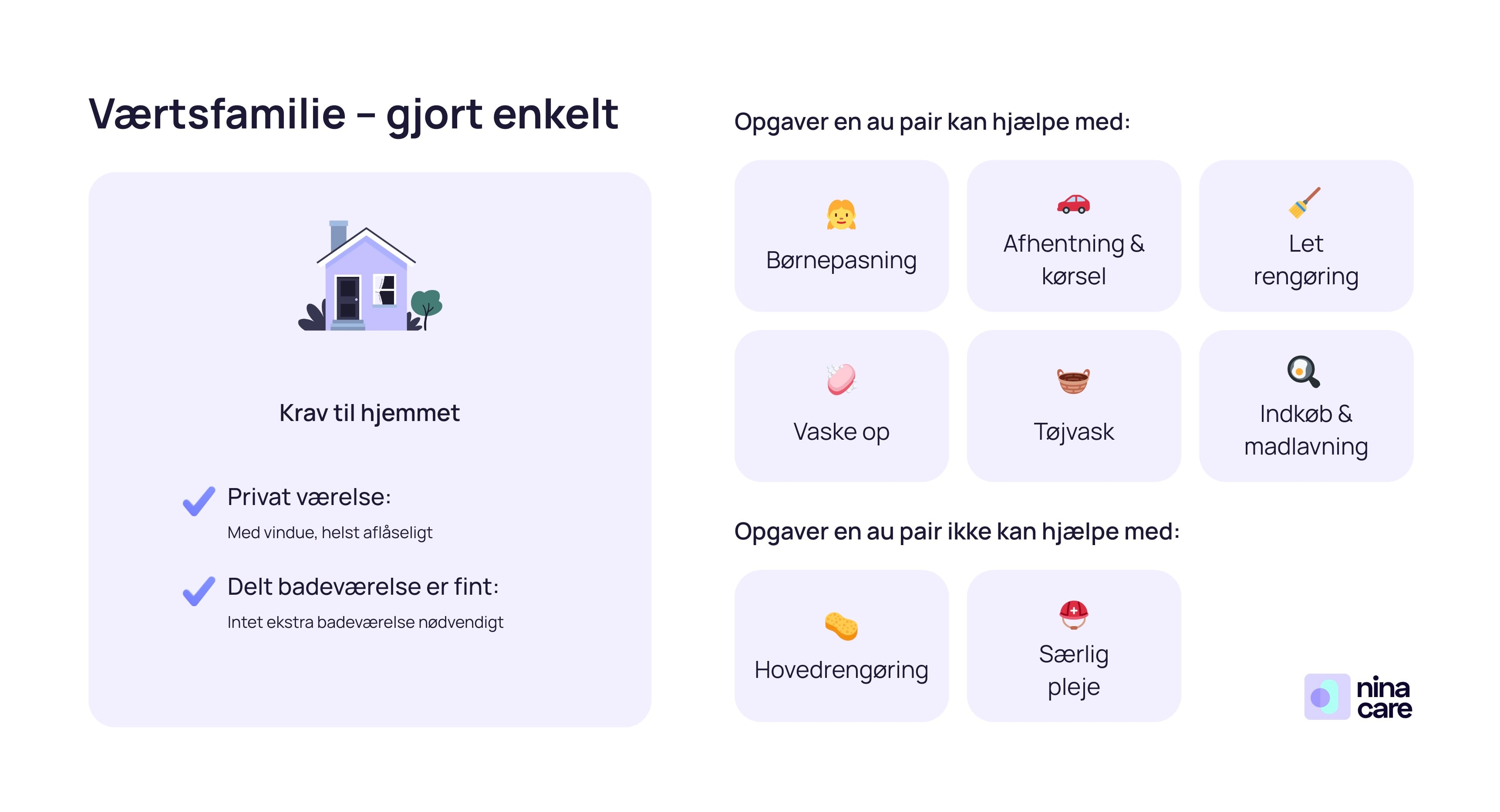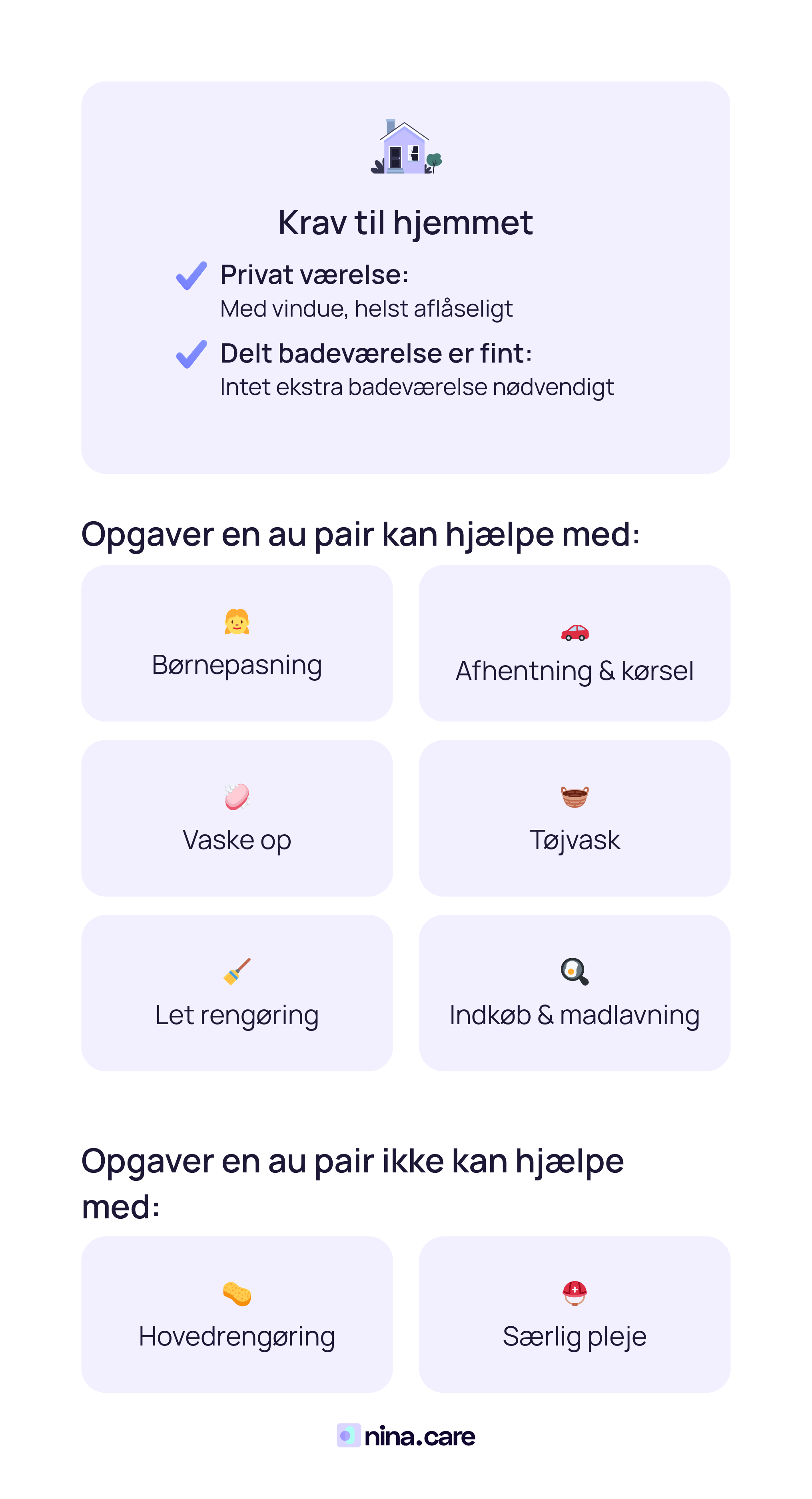 Mest med børnene (skolekørsel, lektier, babysitning, leg) og lette opgaver i hjemmet (rydde børneværelser, dække bord, enkle måltider, børnenes tøjvask). De er ikke rengøringshjælp, barnepiger eller sygeplejersker.