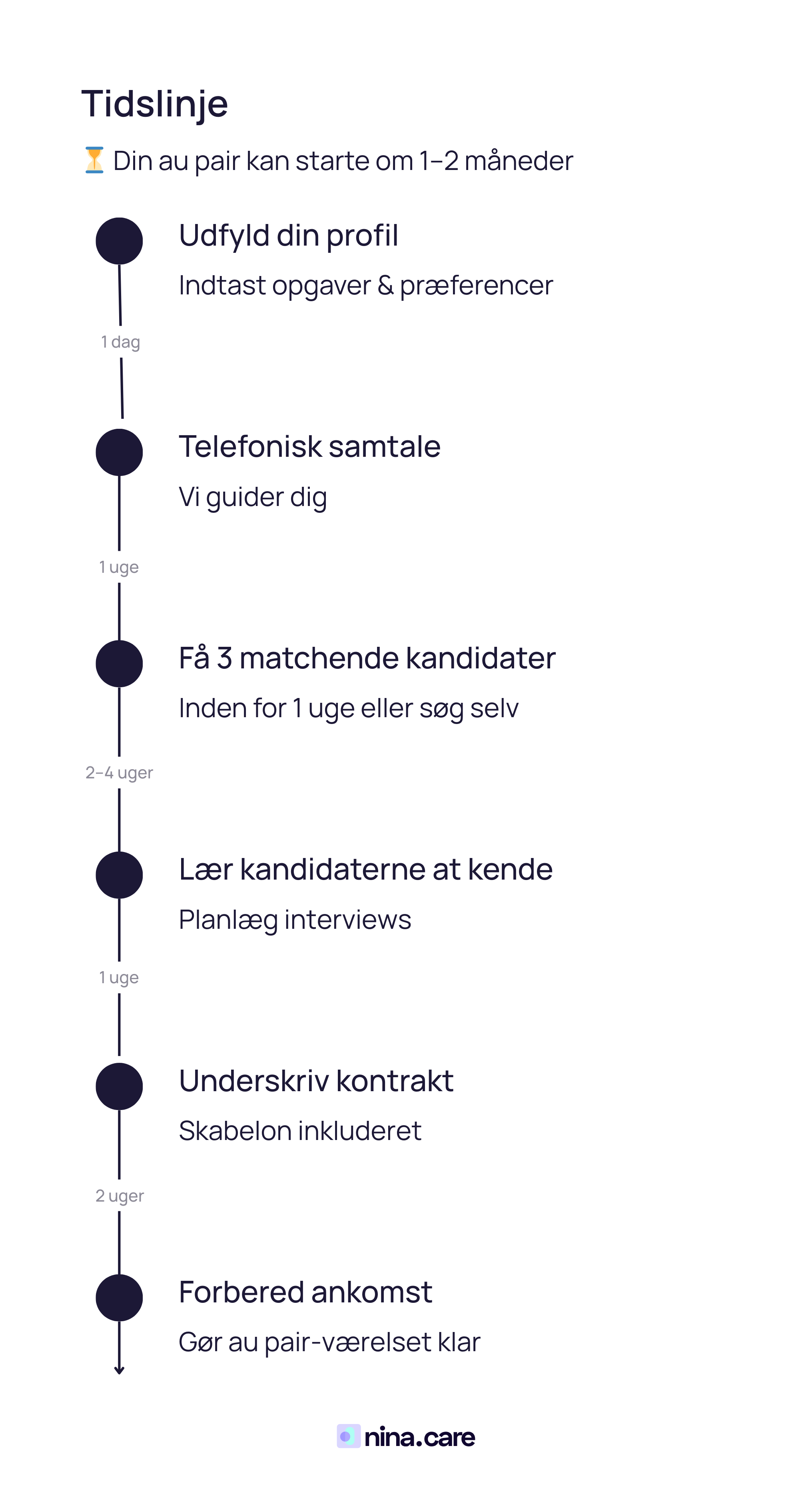 Når matchet er på plads, kan EU-au pairer ofte starte inden for 2–4 uger, mens au pairer uden for EU typisk skal regne med 2–3 måneder pga. visum. Bureauerne hjælper med at få papirerne igennem hurtigere.