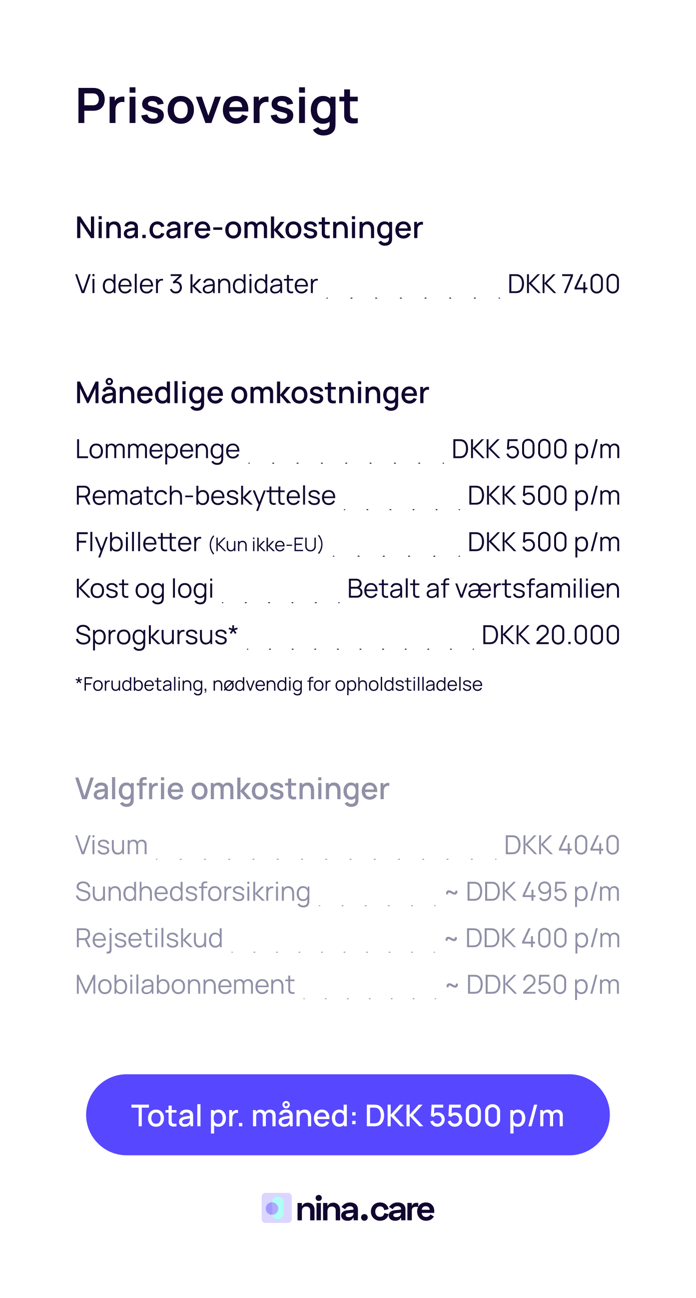 Som værtsfamilie dækker man normalt lommepenge, kost og logi, forsikring og nogle gange sprogundervisning eller bureaugebyrer. Det præcise beløb afhænger af landet, men ligger typisk på €300–600 om måneden. Familien bør lægge et realistisk budget, og au pairen skal vide, at lommepenge ikke er en løn.