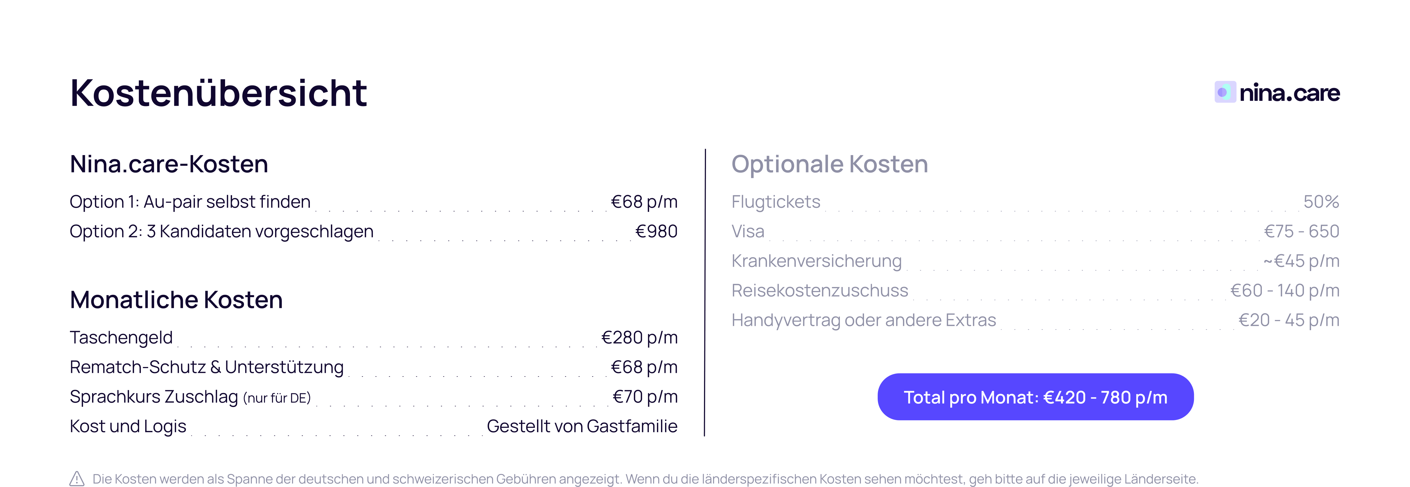 Die meisten Eltern wissen gar nicht, dass ein Au-pair eigentlich mit einer der günstigsten Betreuungsoption ist. Au-pairs können etwa 30 Stunden pro Woche helfen. Schau dir unten die Preise nach Land an!