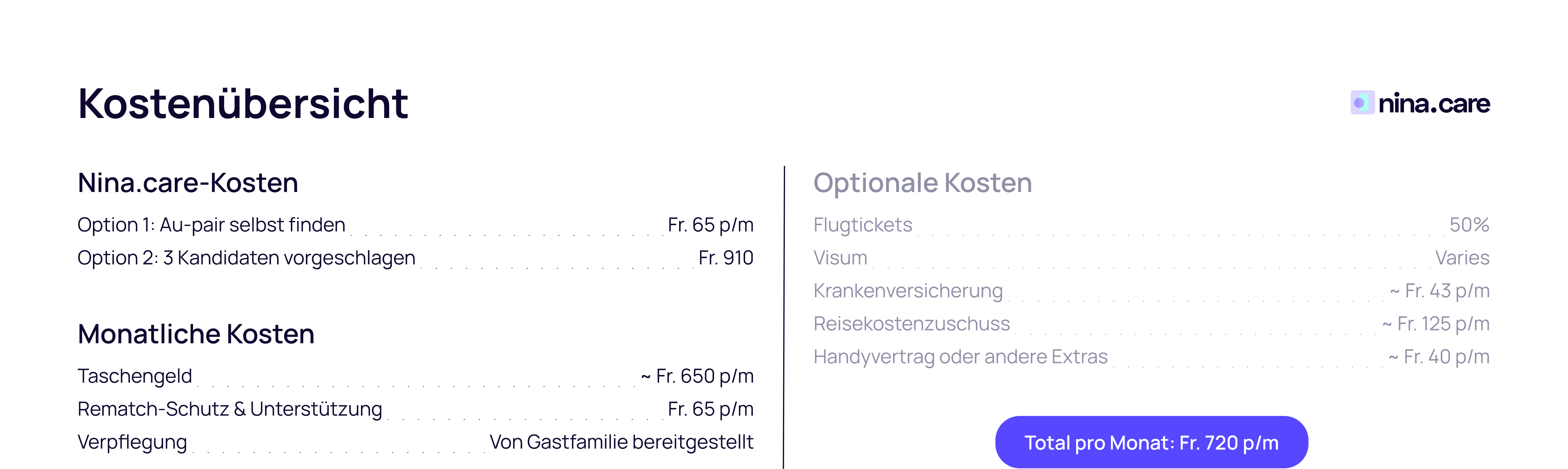 Einige Familien beteiligen sich auch an Transportkosten oder Sprachkursen, wodurch sich die durchschnittlichen monatlichen Kosten für Gastfamilien auf etwa Fr. 720 pro Monat belaufen.