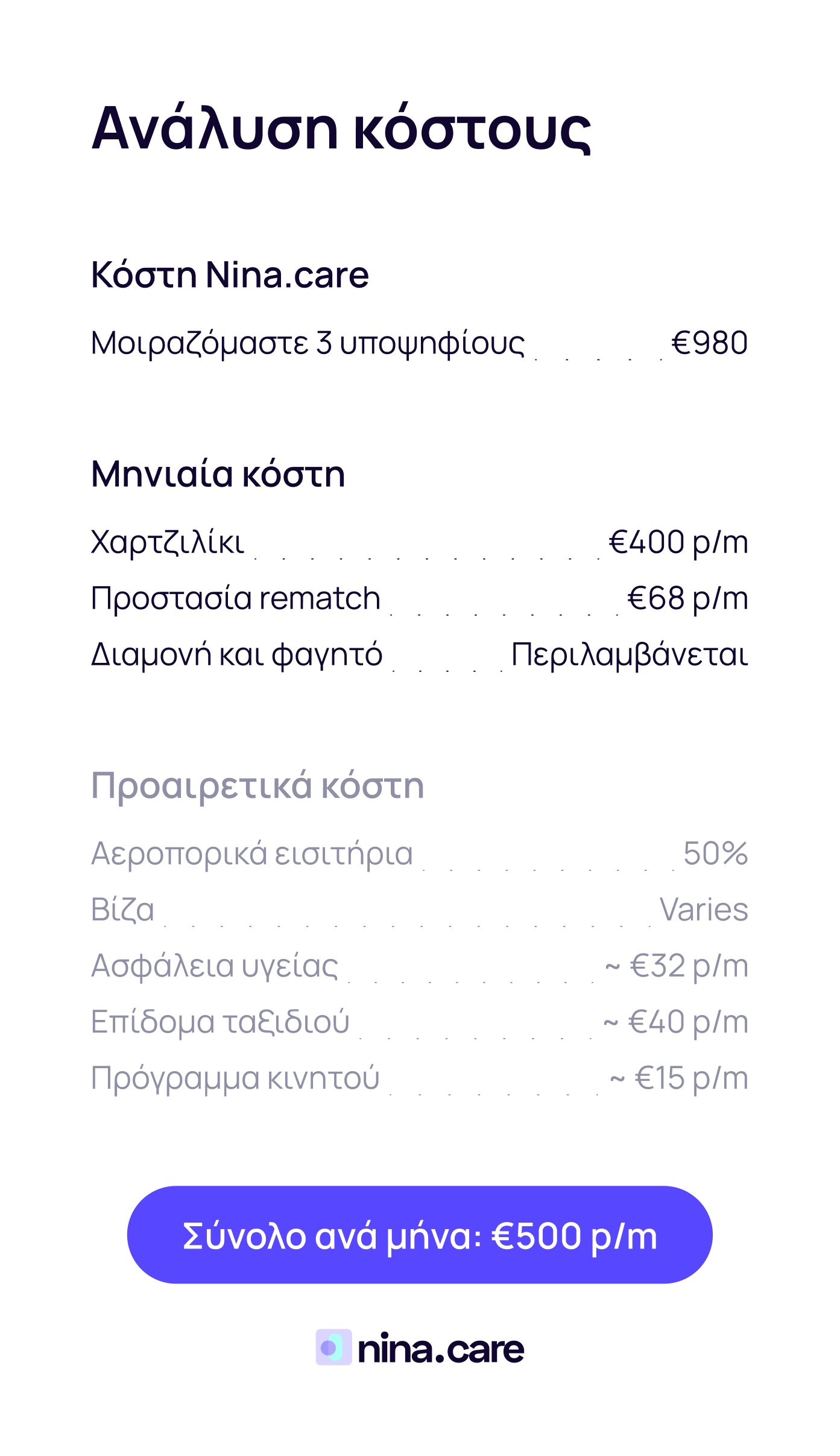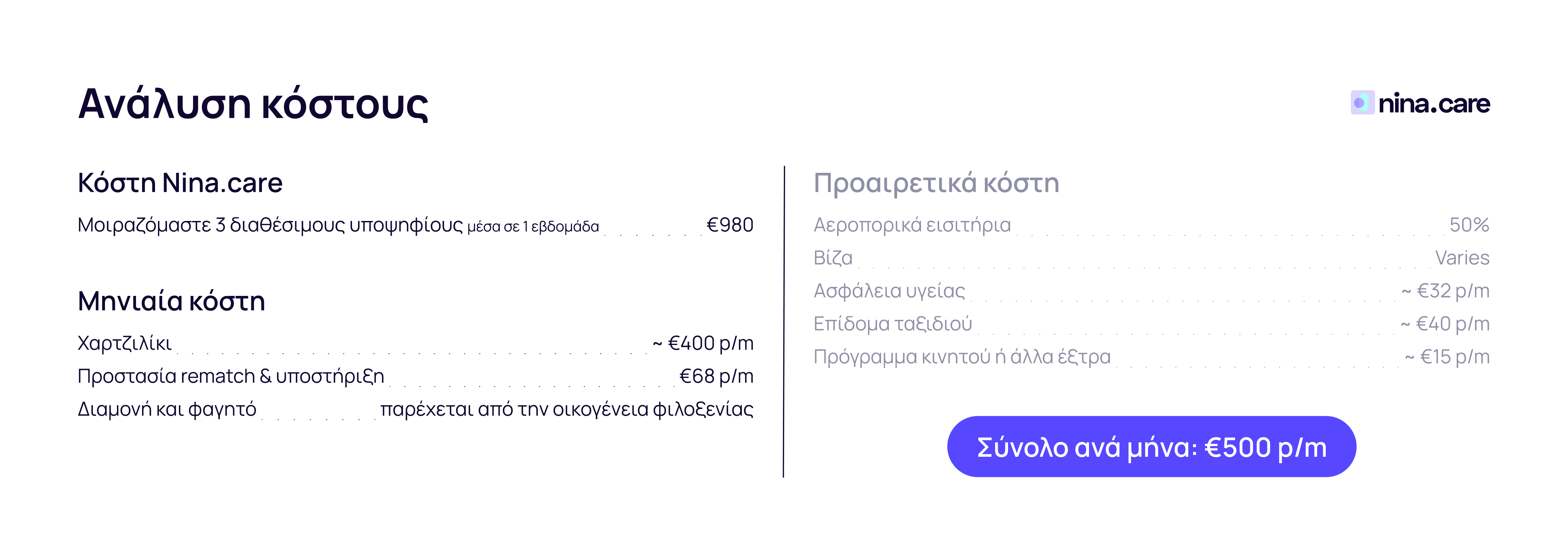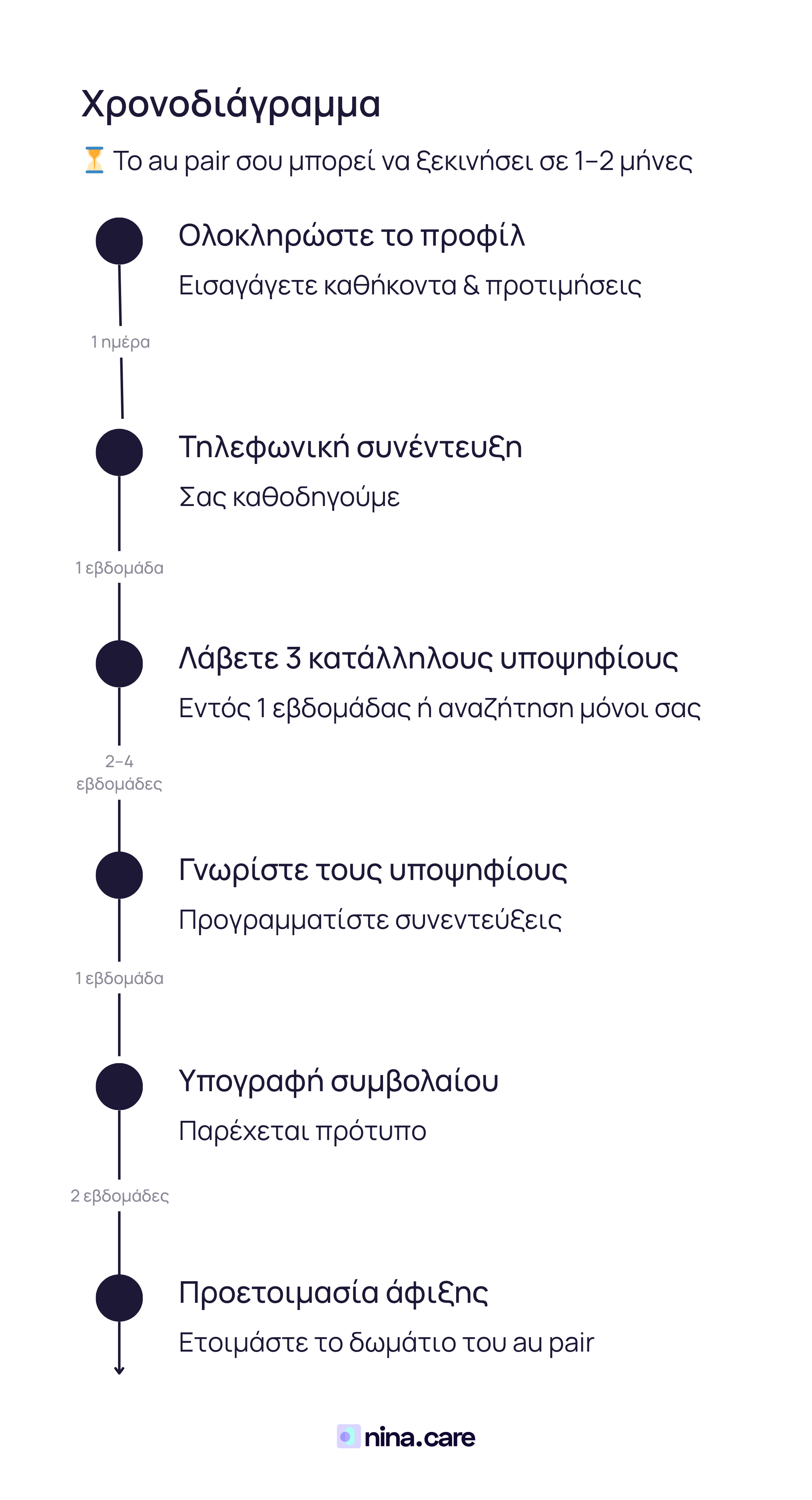 Πάνω από 3.000 οικογένειες επέλεξαν au pair μέσω Nina.care: λιγότερο άγχος, περισσότερη δομή, και τα παιδιά μαθαίνουν αγγλικά ή ισπανικά. Πολλά au pairs έχουν δίπλωμα οδήγησης και εμπειρία με νεογέννητα. Συχνά, το au pair σας μπορεί να ξεκινήσει μέσα σε 2 μήνες.