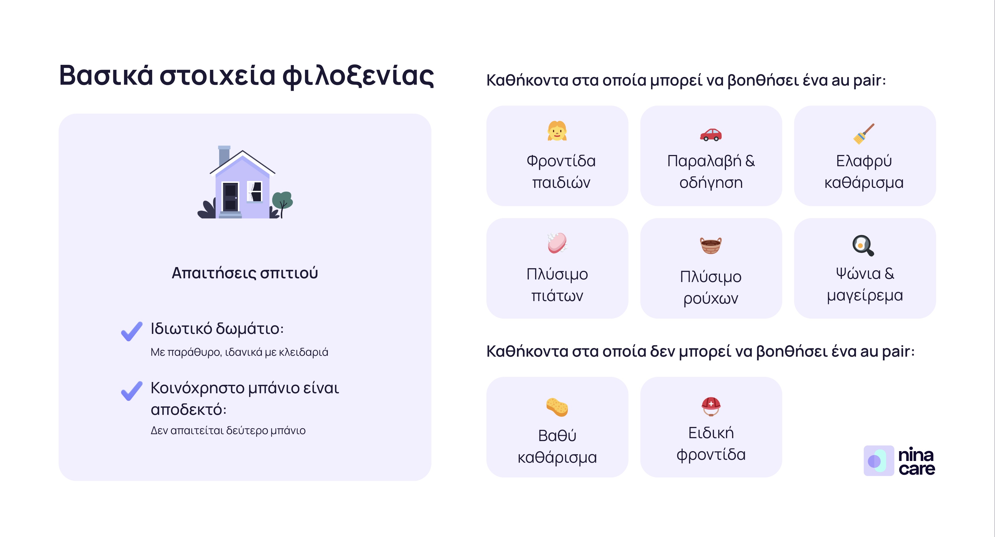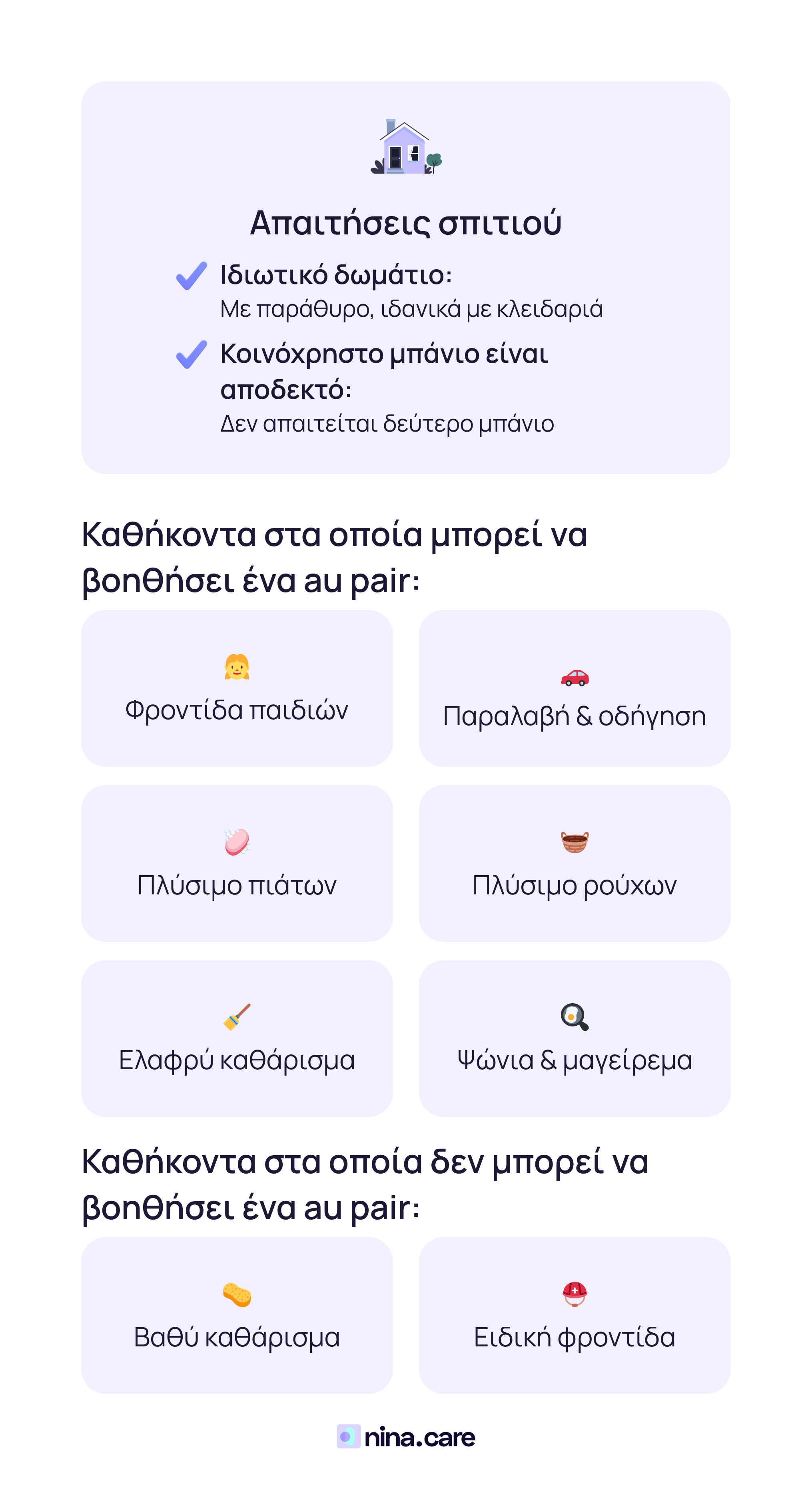 Ένα au pair βοηθά 30 ώρες την εβδομάδα με καθαριότητα, μαγείρεμα, σχολικές μεταφορές και ψώνια, για περισσότερη ηρεμία και ποιοτικό χρόνο.