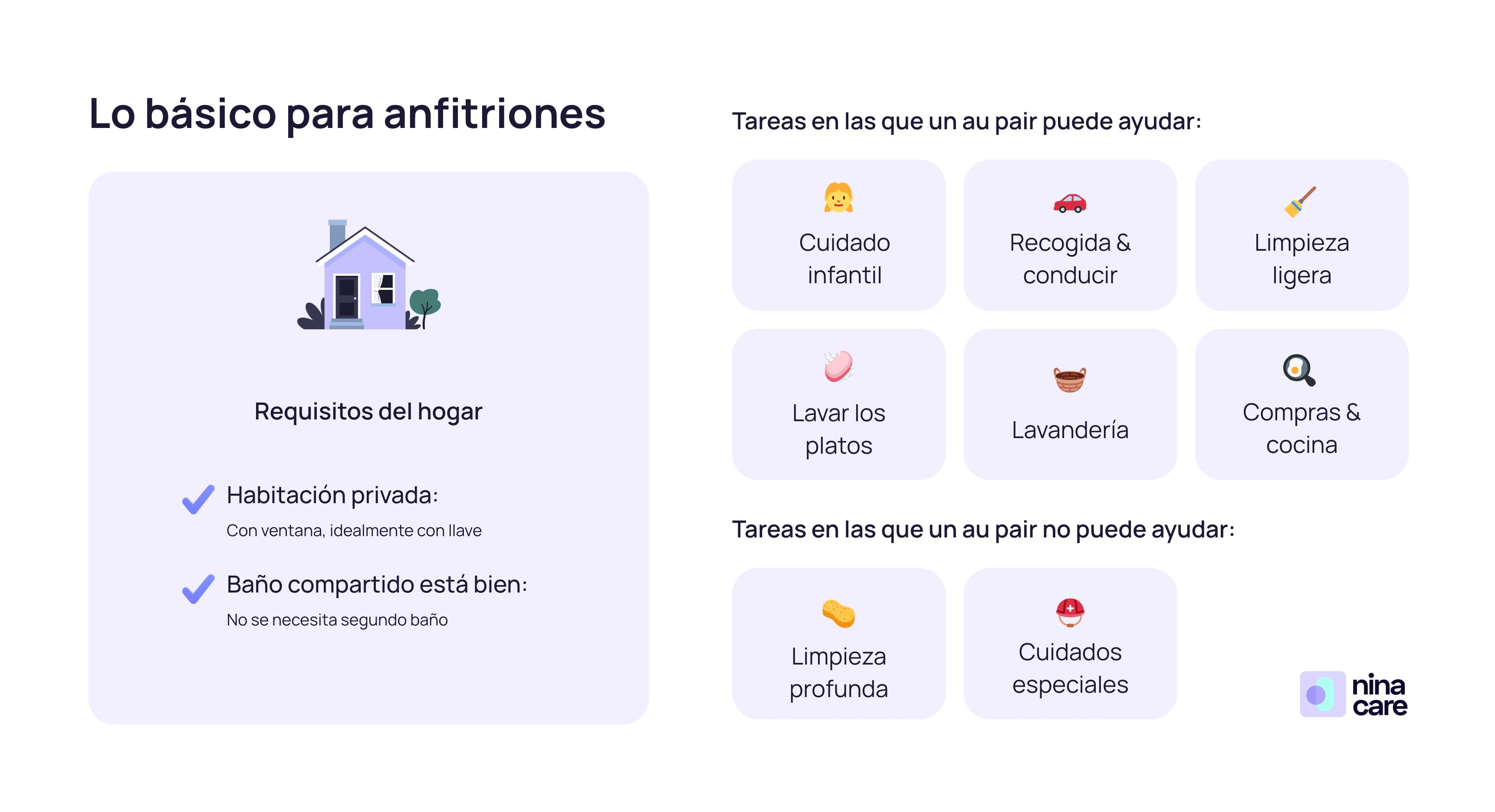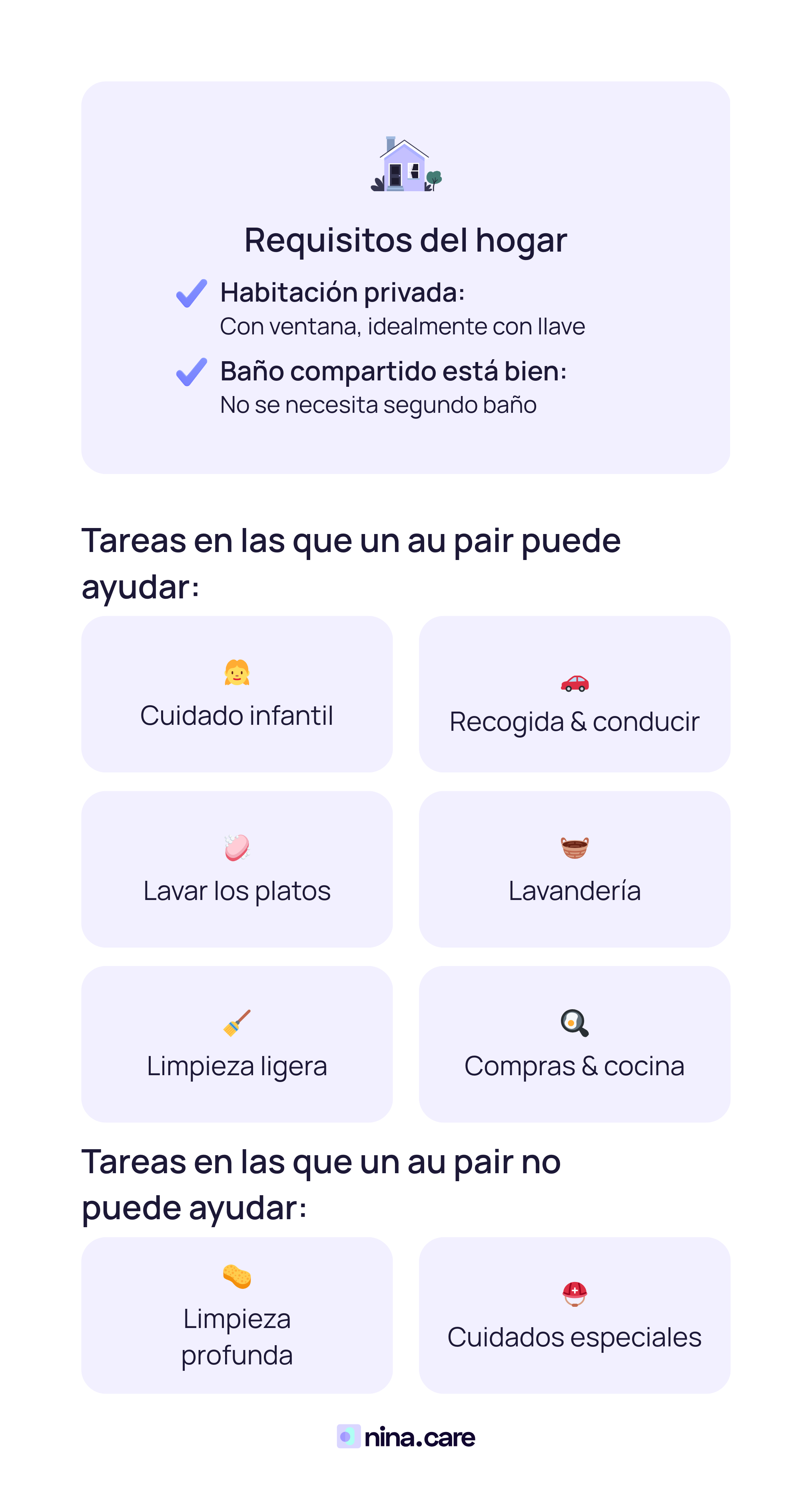 Un au pair ayuda principalmente con el cuidado de los chicos (llevarlos o buscarlos en la escuela, ayuda con la tarea, babysitting, juegos) y con tareas domésticas ligeras (ordenar las piezas de los chicos, poner la mesa, preparar comidas simples, lavar la ropa de los niños). No es empleado de limpieza, ni niñera profesional, ni enfermero/a.