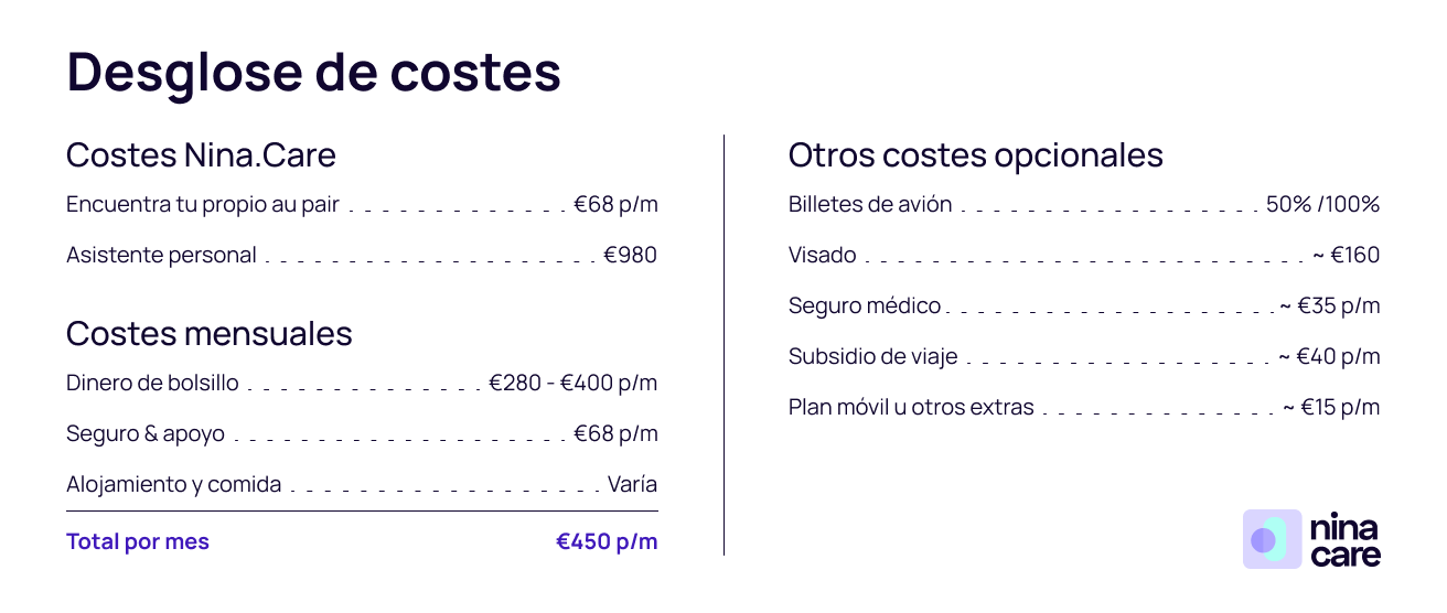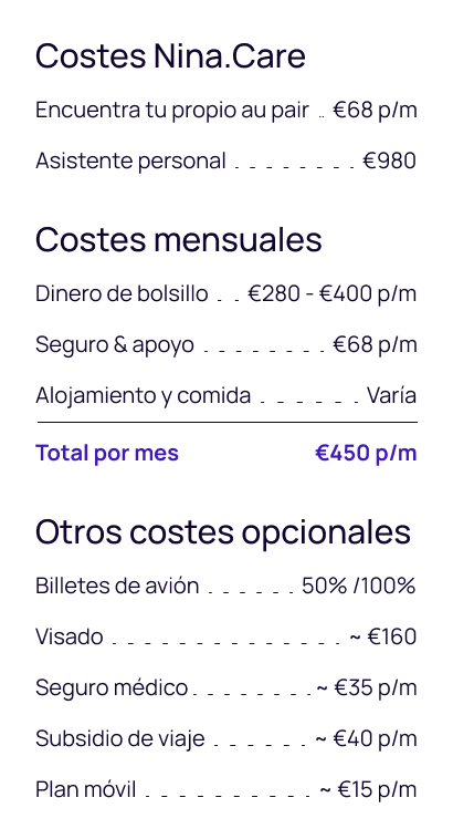 En España, se suele considerar un mínimo de unos 70 €/semana*(≈ 280 €/mes) como dinero de bolsillo habitual; muchas familias pagan entre 70 € y 100 €/semana (≈ 280–430 €/mes), dependiendo de las horas y del cuidado adicional de los niños. El alojamiento y la manutención están incluidos.