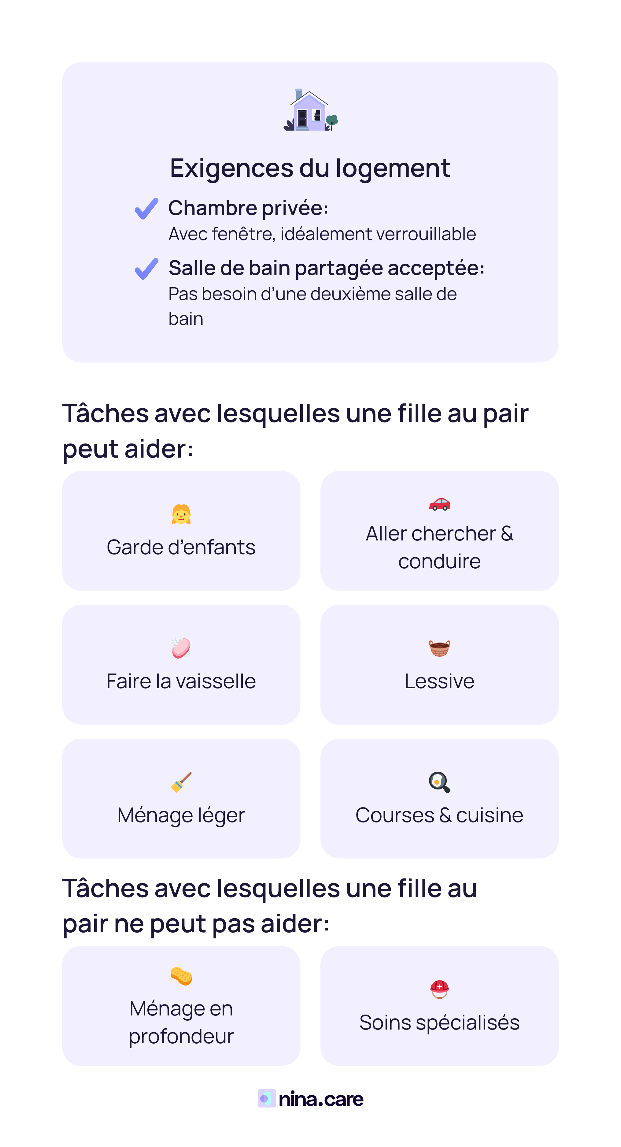 Un(e) au pair aide principalement à la garde des enfants (accompagner/aller chercher à l’école, aide aux devoirs, babysitting, jeux) et à de petites tâches ménagères (ranger les chambres des enfants, mettre la table, préparer des repas simples, lessive des enfants). Il/elle n’est pas un(e) employé(e) de maison, une nounou professionnelle ou un(e) aide-soignant(e).