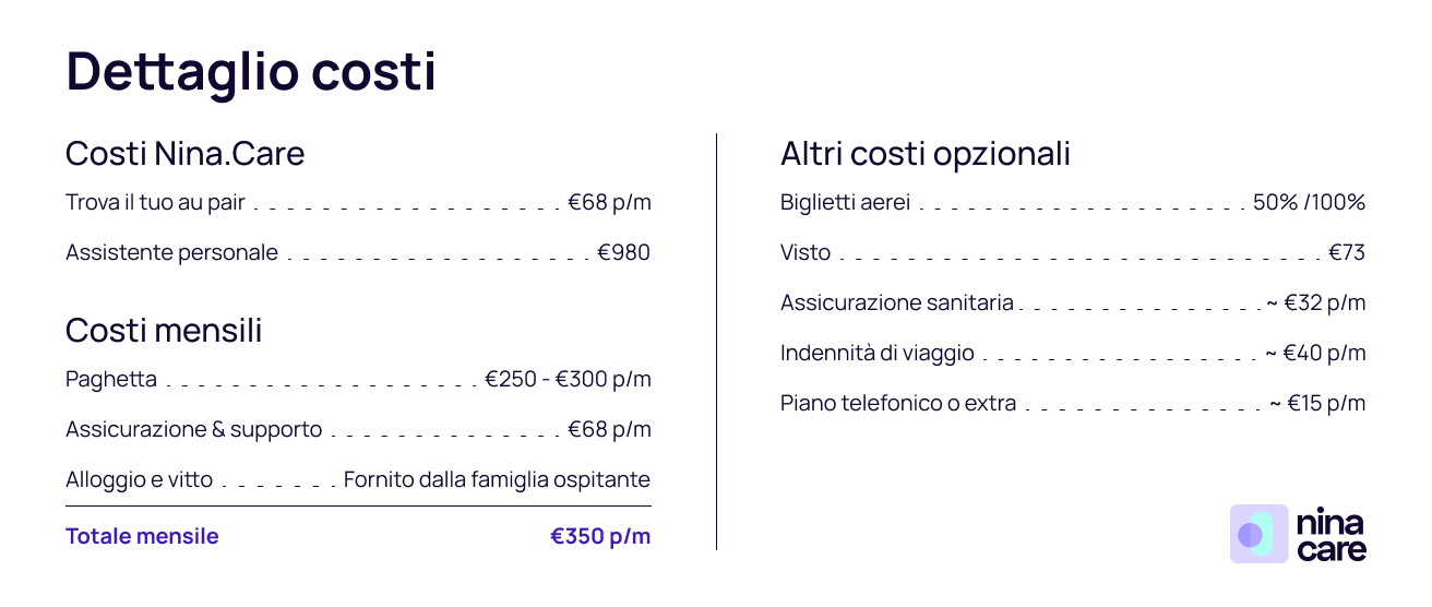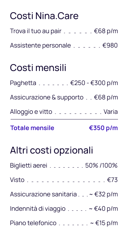Le agenzie richiedono tra 100 € e 2.000 € per i servizi di abbinamento, supporto per il visto (se necessario) e gestione pre-arrivo. Le famiglie che reclutano privatamente di solito coprono solo i costi del contratto e dell’assicurazione.
