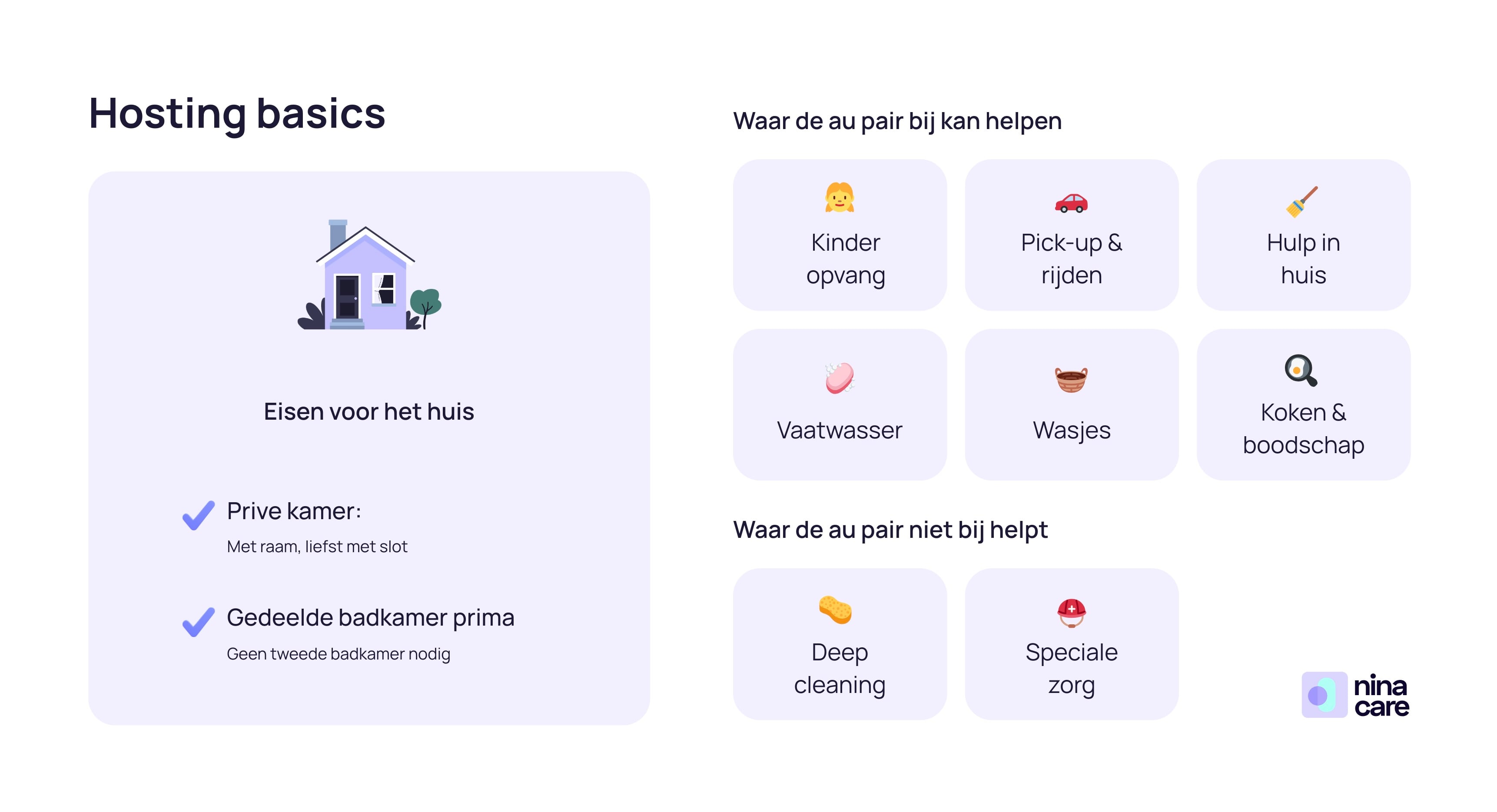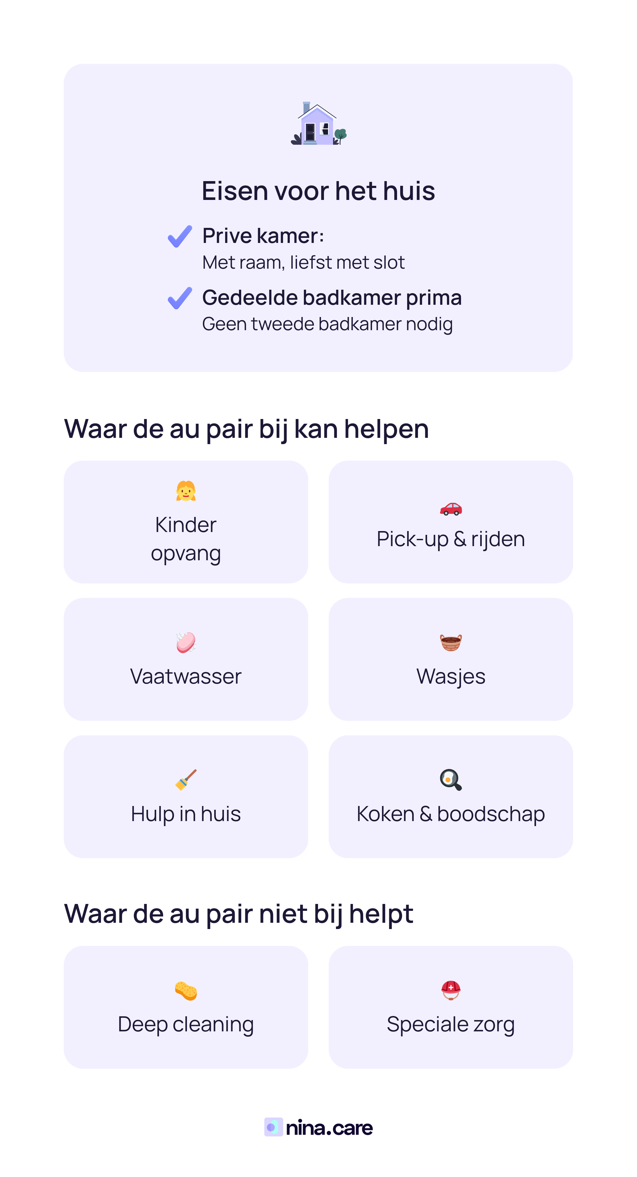 Een au pair helpt voornamelijk bij de kinderzorg (brengen/halen van school, eenvoudige huiswerkbegeleiding, babysitten, speeltijd) en bij lichte huishoudelijke taken (kinderkamers opruimen, tafel dekken, eenvoudige maaltijden bereiden, kinderkleding wassen). Ze zijn geen schoonmakers, nanny’s of verpleegkundigen.