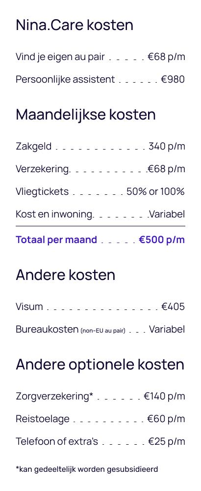 n Nederland is het verplicht om een erkend au-pairbureau te gebruiken voor visa-kandidaten (niet-EU au pairs). Deze bureaus helpen bij de matching, het visum en de aankomst. Waar nodig liggen de bureaukosten tussen €100 en €3.000, inclusief werving, screening en alle voorbereidingen voor aankomst.