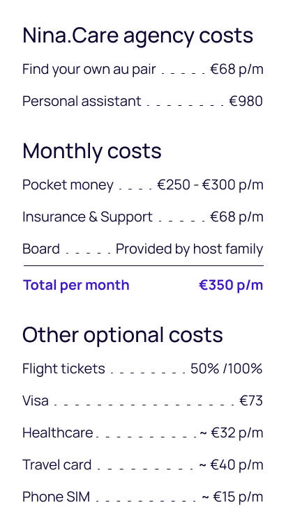 Agencies charge between โฌ100 and โฌ2,000 for matching services, visa support (if needed), and pre-arrival administration. Families who recruit privately usually only cover the contract and insurance setup costs.