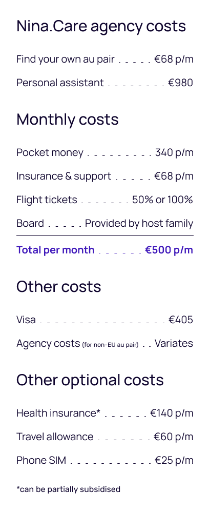 In the Netherlands, using an au pair agency is mandatory for visa candidates (non EU-candidates. Agencies assist with matching, visas, and arrival. Where required, agency fees range from โฌ100 to โฌ3,000, covering recruitment, screening, and all pre-arrival logistics.โจFamilies who find their own au pair typically pay less, just for screening and visa support.