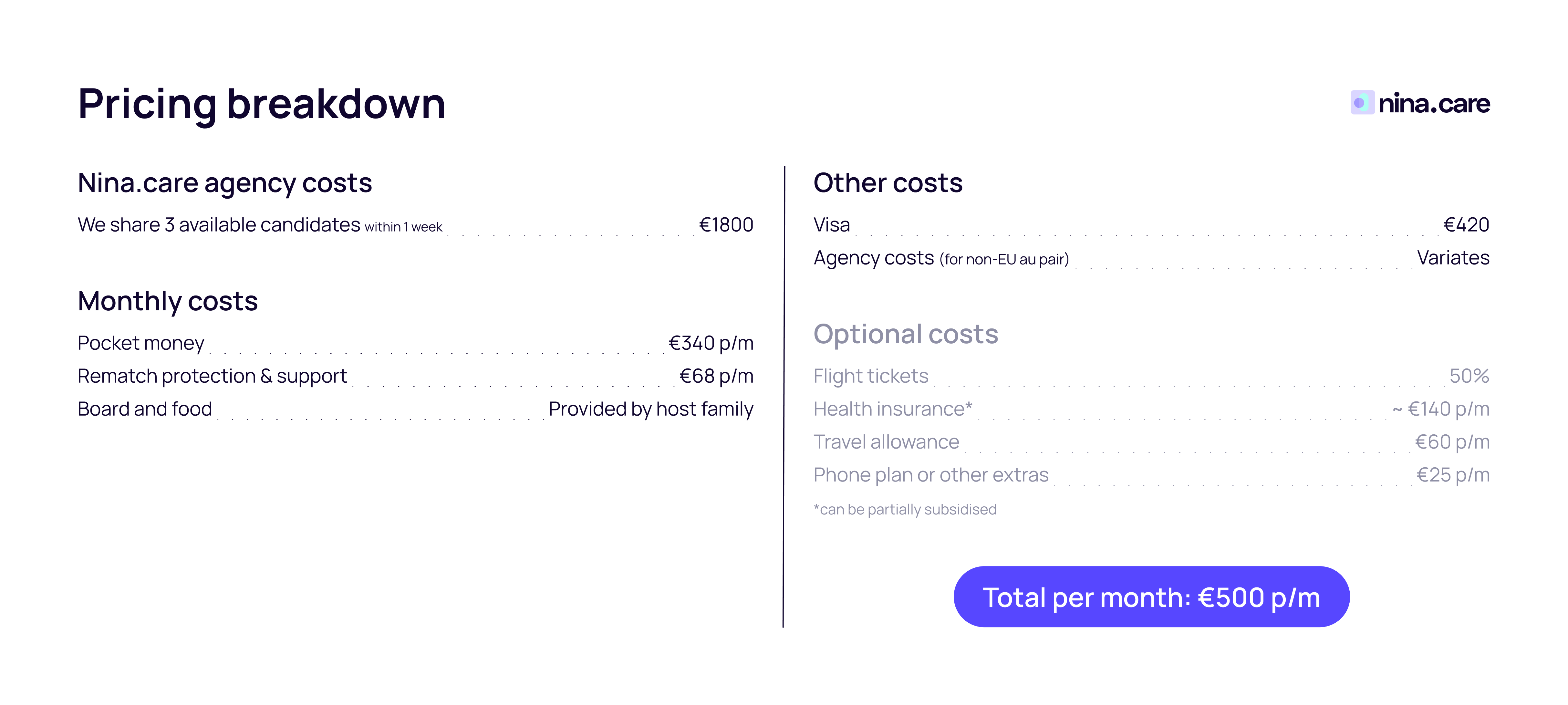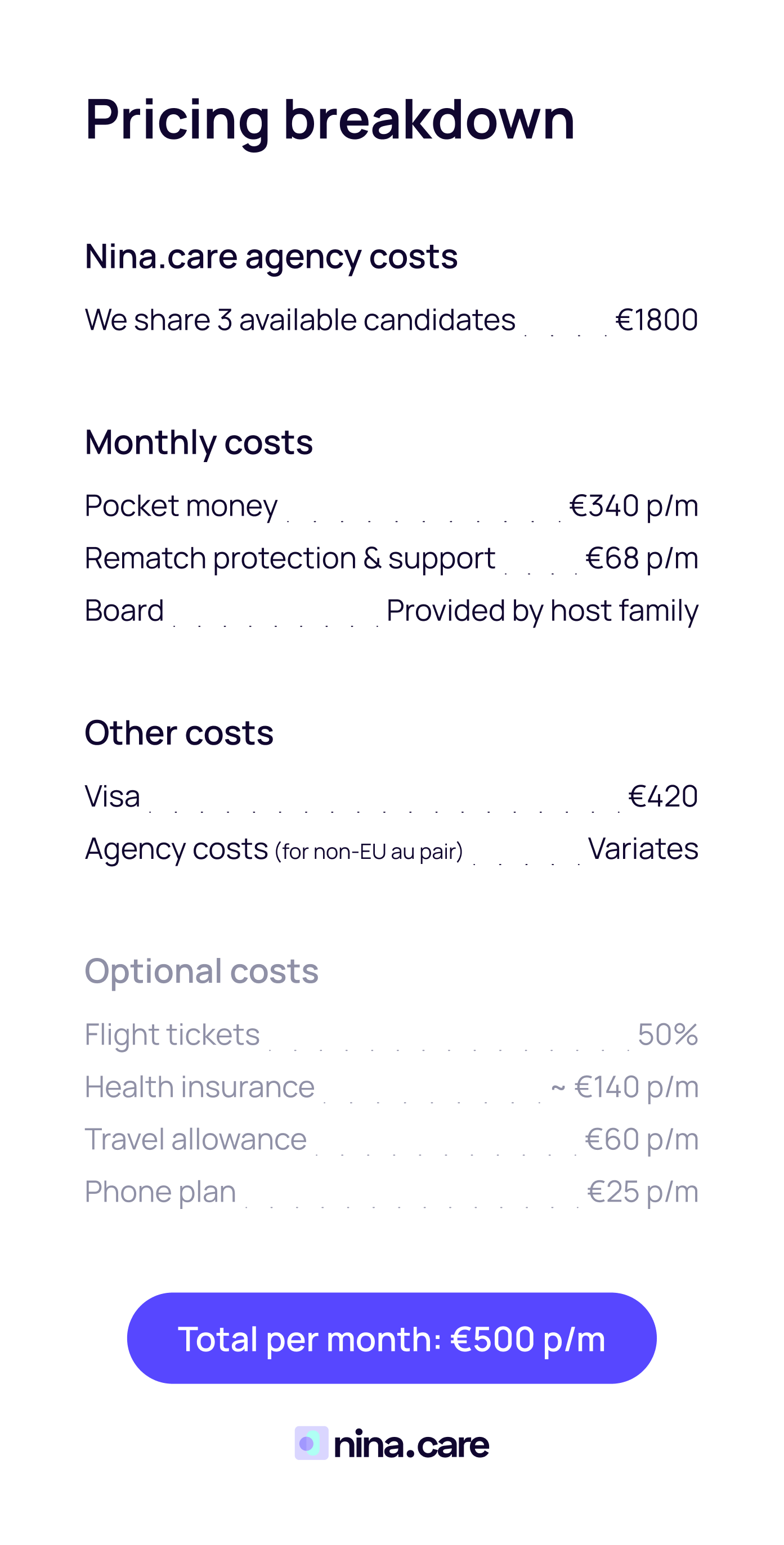 European au pairs are the most affordable, fastest, and simplest solution in the Netherlands. No visa means no IND costs or administration, you can start within 2 weeks, and save hundreds of euros. At Nina.care, you choose: search yourself for โฌ68 or full service (โฌ1,800), with a recruiter who handles everything for you.